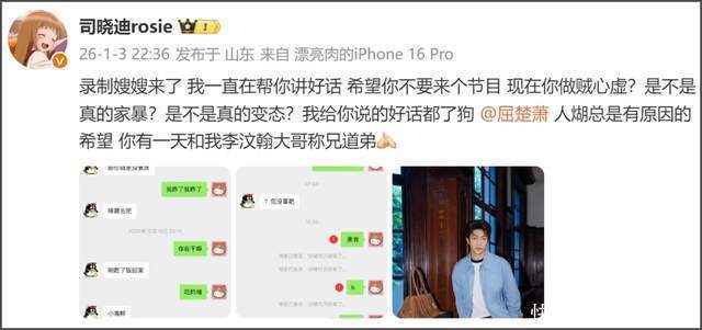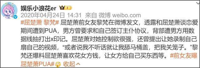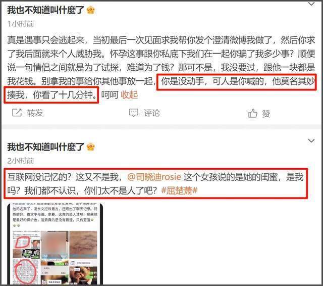 屈楚萧前女友爆料当年细节,称她是被屈楚萧叫来的朋友打的,屈楚萧在一边看了十几分钟,而司晓迪爆料的所谓闺蜜,似乎是当年爆料屈楚萧有特殊癖好、PUA的那一个。