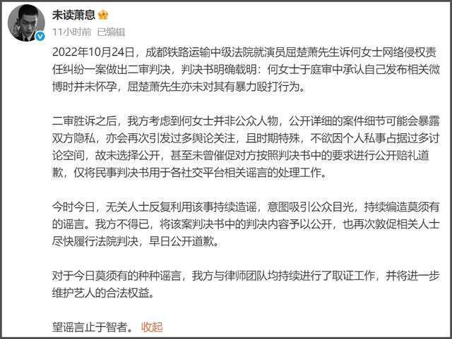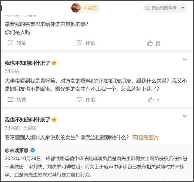 随后屈楚萧工作室还公开胜诉书,似乎想以此来澄清屈楚萧没有家暴,但没想到名誉权败诉的前女友看不下去了,直接出来怒骂屈楚萧故意找别的事当挡箭牌,司晓迪爆料的被打女生另有其人,不是判决书中的人。